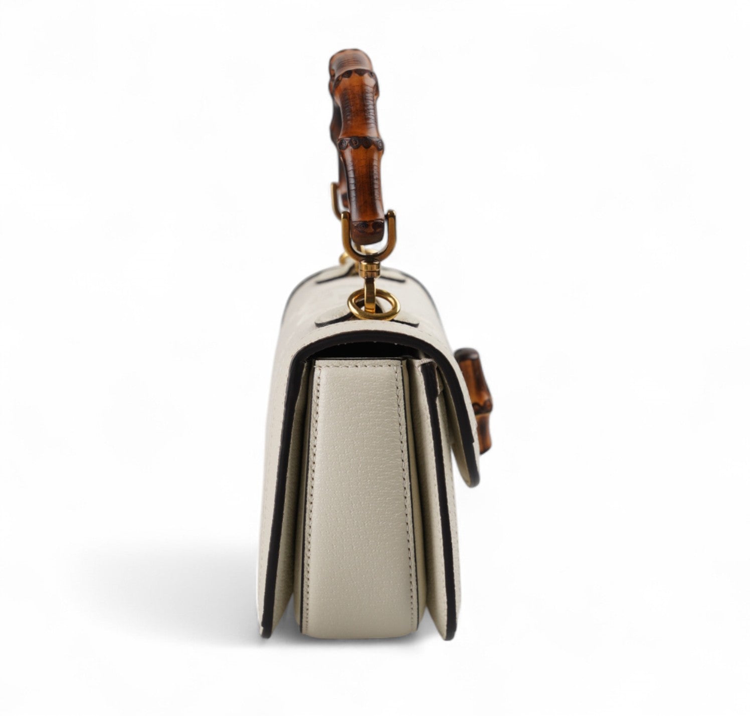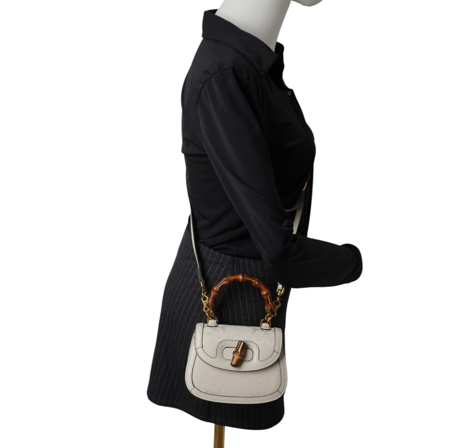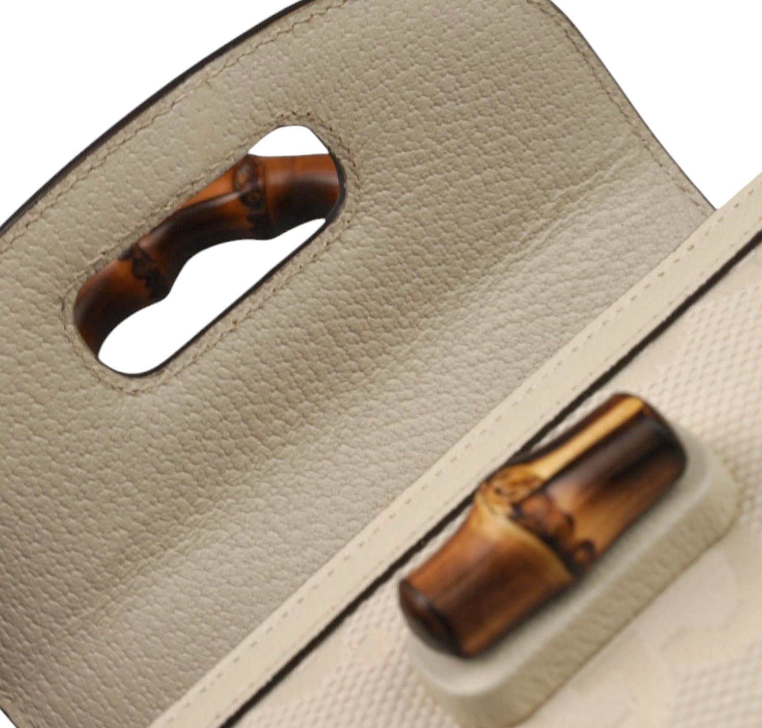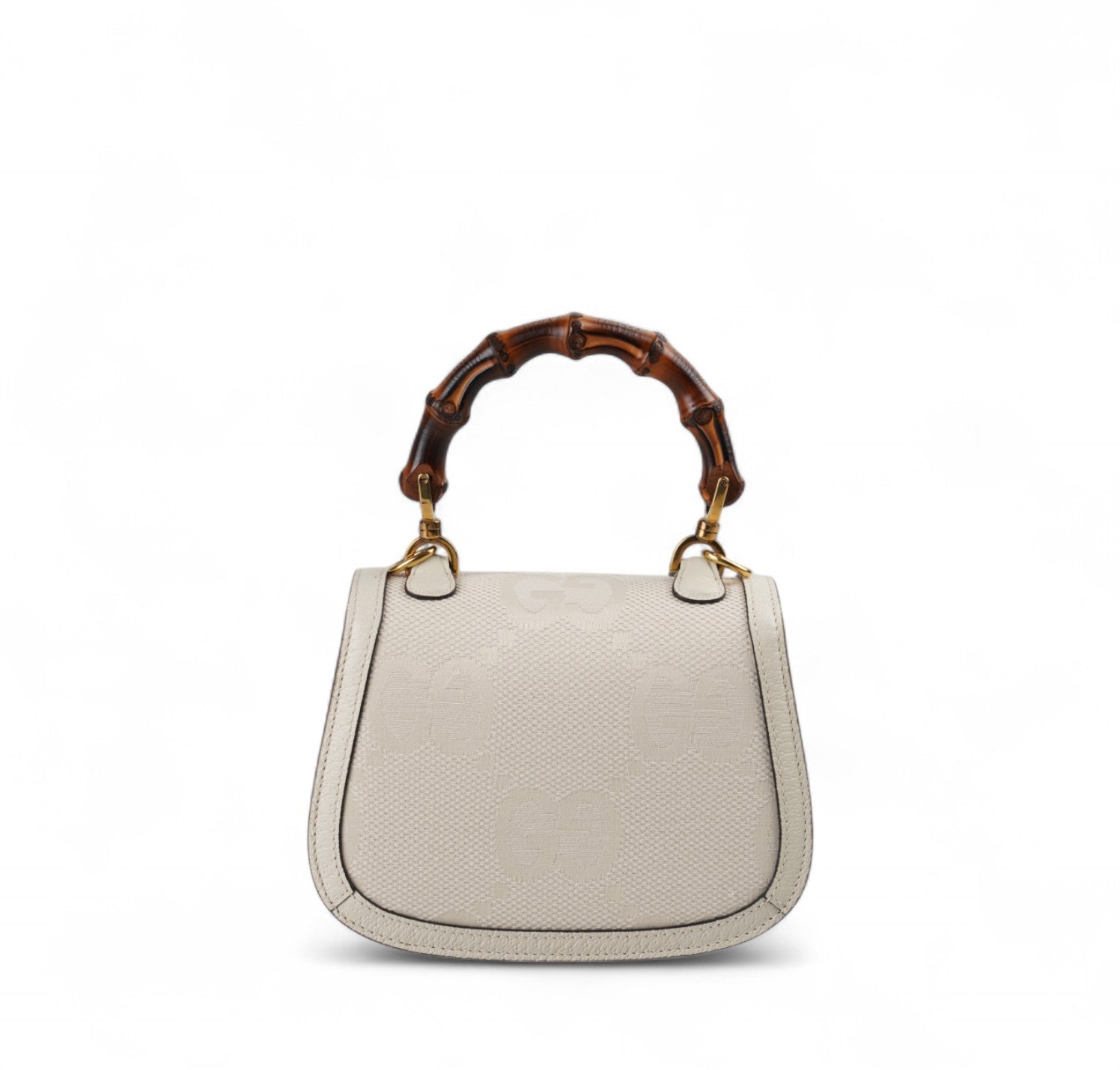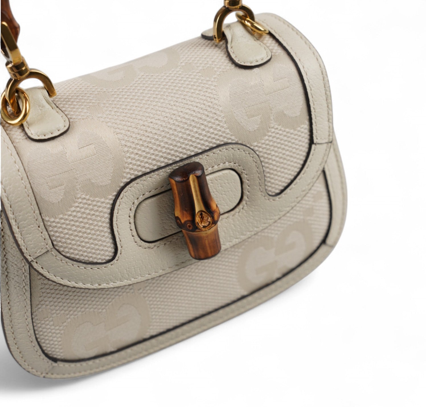 Borsa Gucci, modello Bamboo 1947 Mini, realizzata in Tela Monogram GG Jumbo color Avorio con finiture in pelle tono su tono. Manico superiore e chiusura a patta con dettaglio Bamboo. Dotata di tracolla doppia tracolla, una in Tessuto Web Blu e Rosso e una sottile in Pelle. Interno foderato in tessuto con scomparto unico e tasche piatte. In condizioni pari al nuovo, con micro segni di stoccaggio lievemente percettibili, sotto la pattina.