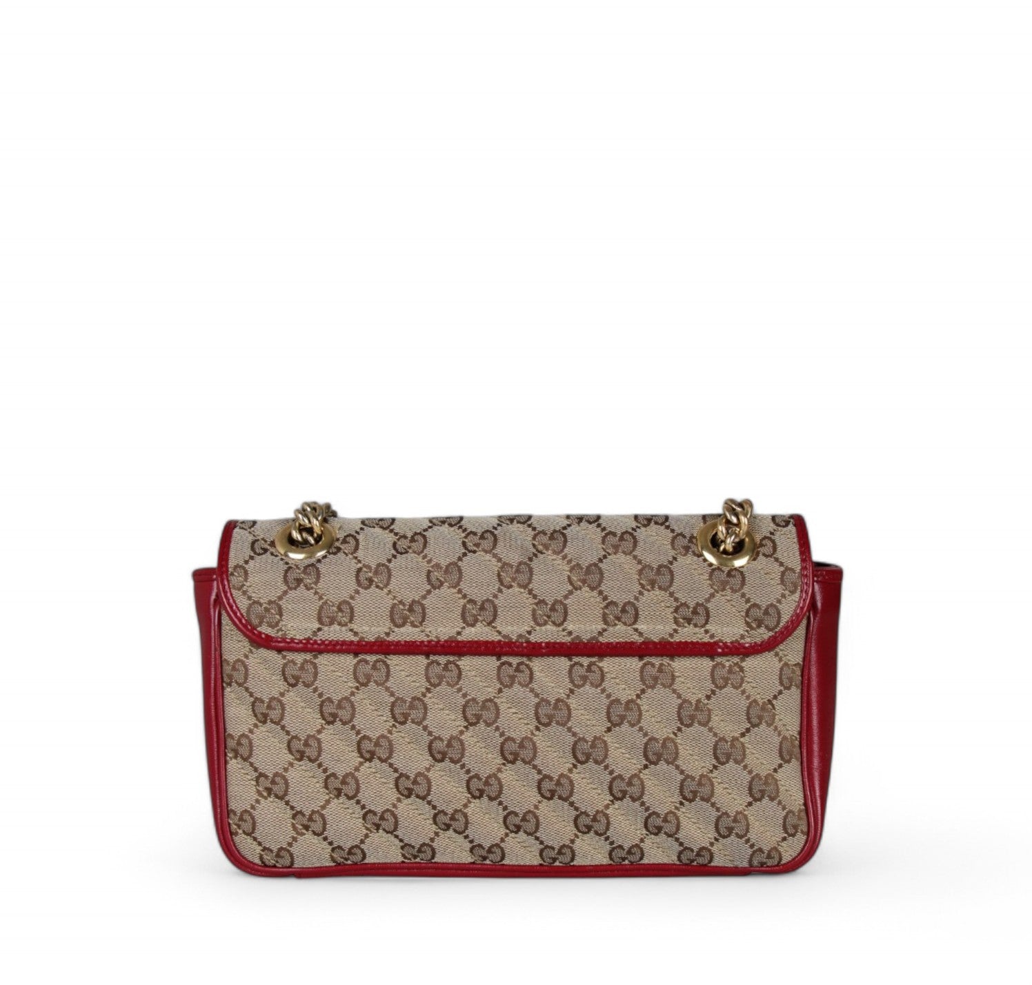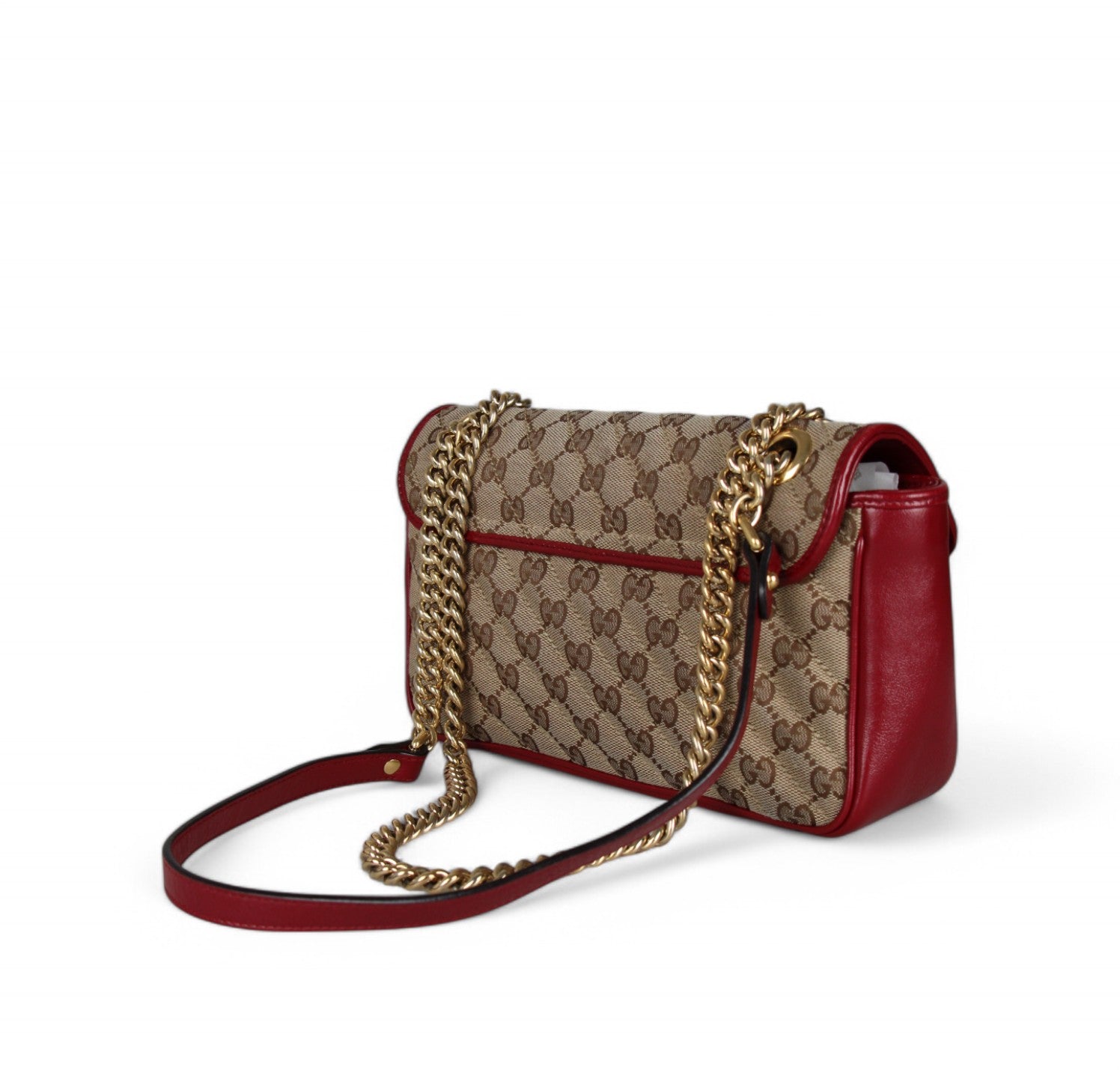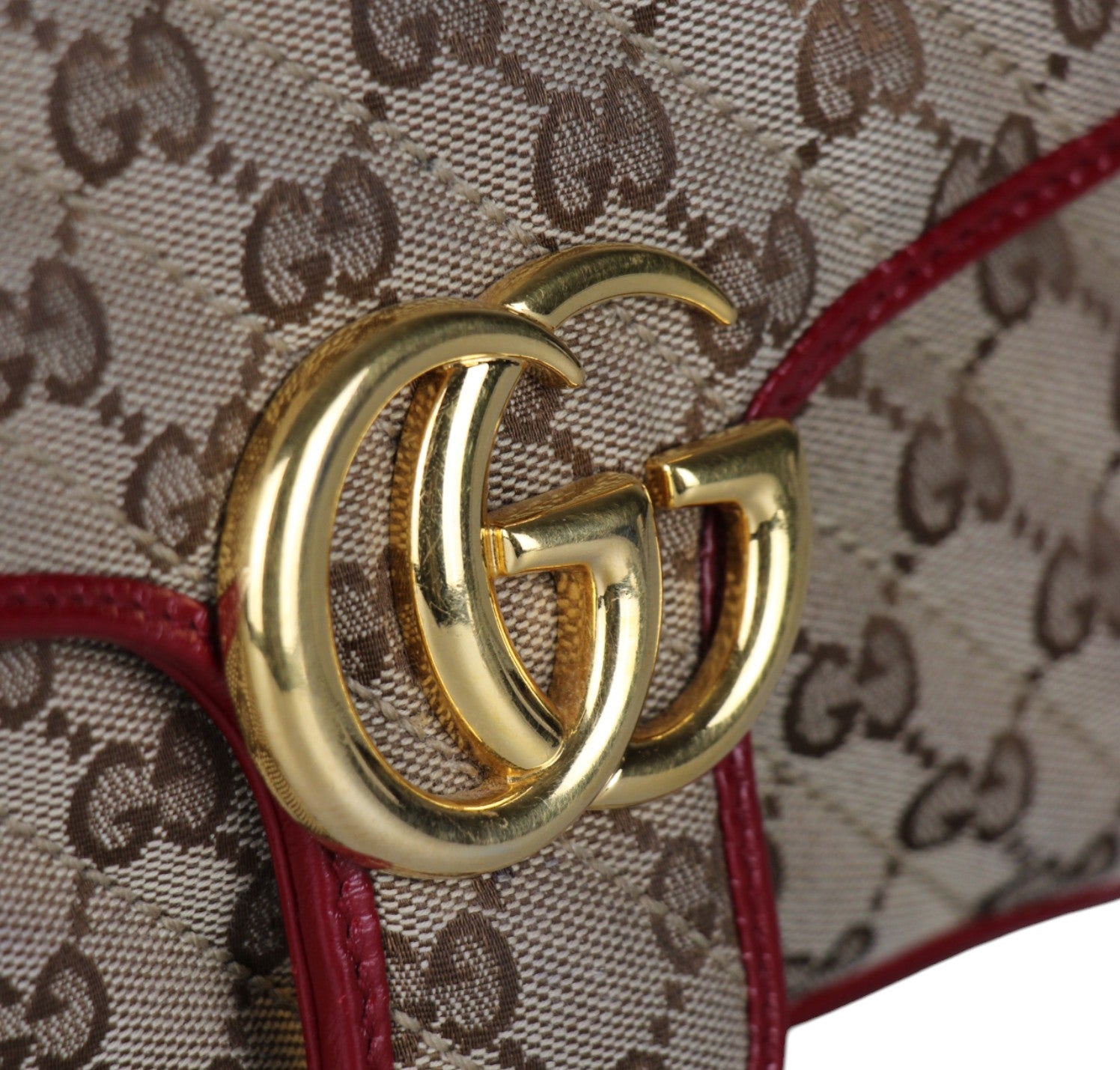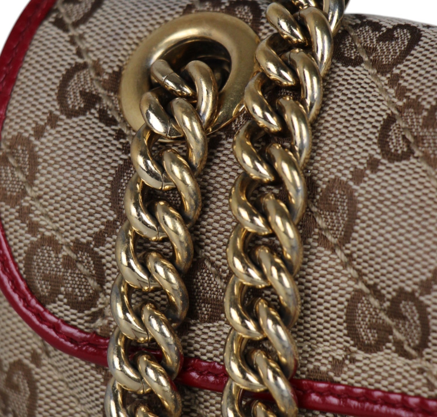 Borsa a a tracolla Gucci modello GG Marmont realizzata in tessuto beige impreziosito da Monogram GG a contrasto color Ebano e impunture diagonali. Dettagli in pelle Rosso Ancora. Metalleria dorata effetto lucido. Internamente foderata in tessuto scamosciato beige, tasca interna con cerniera. Chiusura principale a molla impreziosita da logo GG. Munita di tracolla superiore scorrevole utilizzarla anche a spalla. Minimi segni d'uso generali.