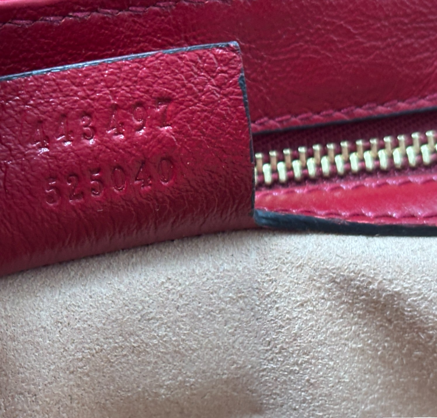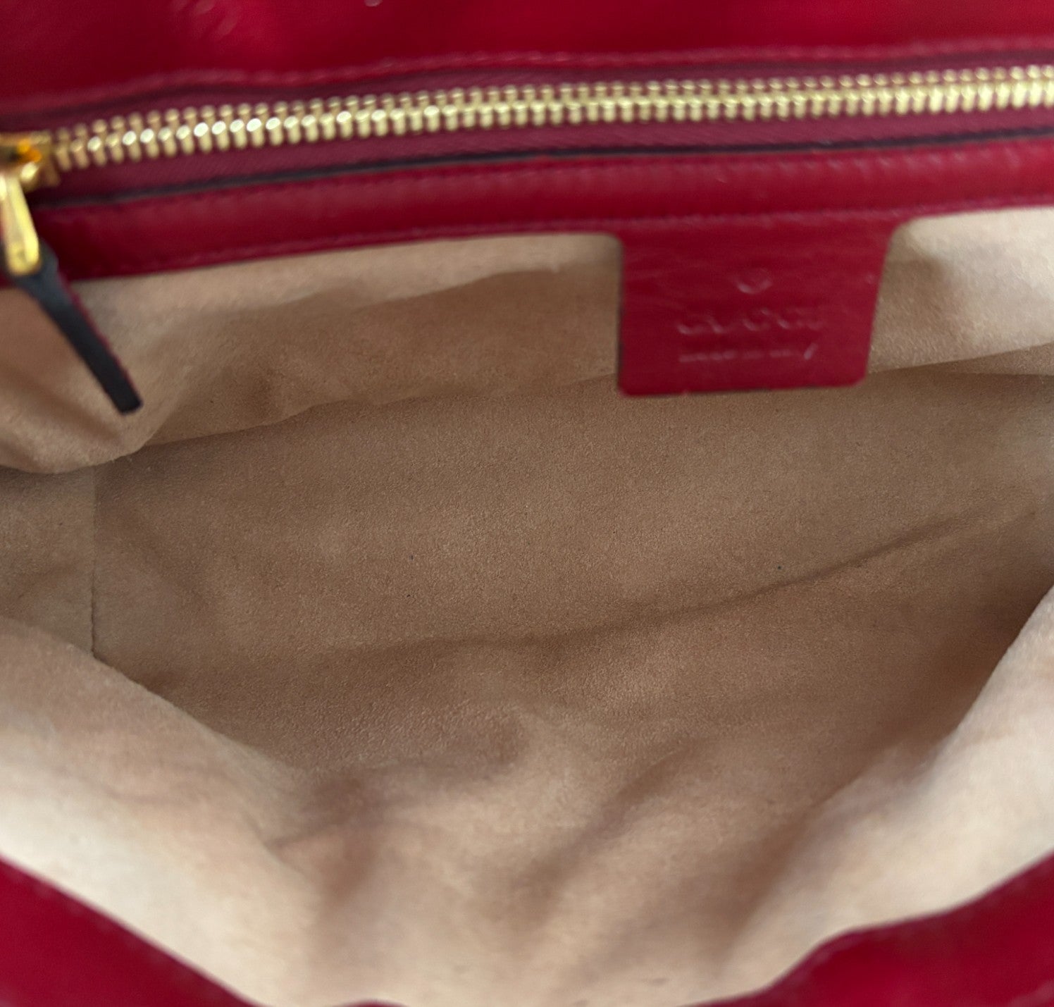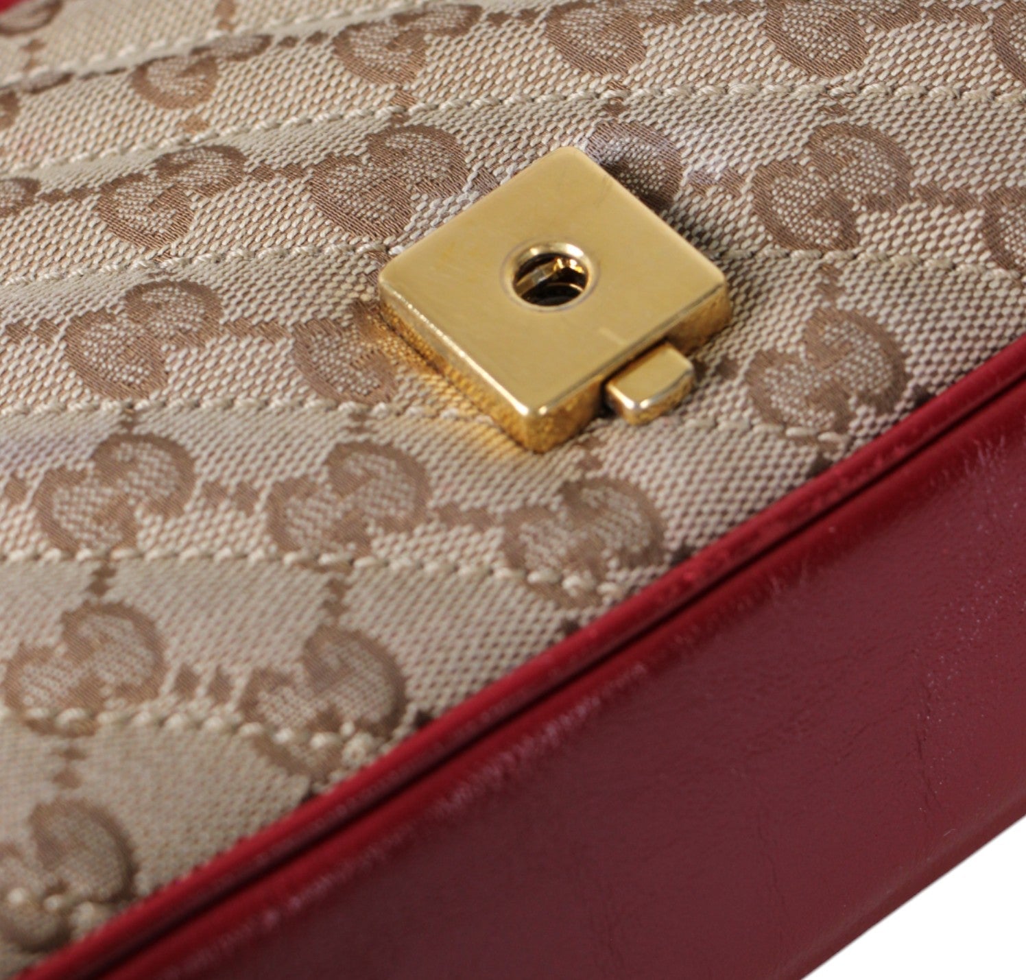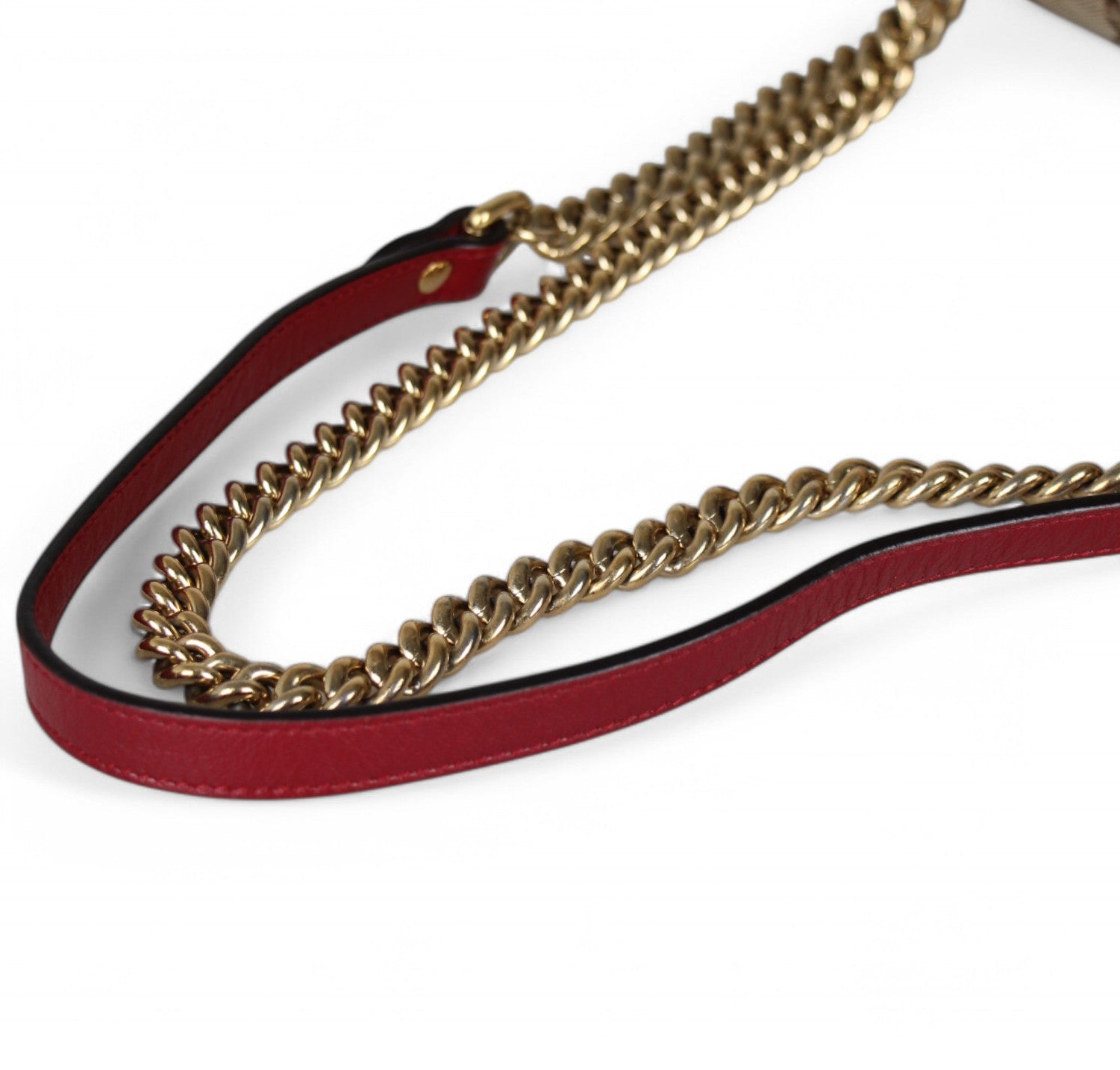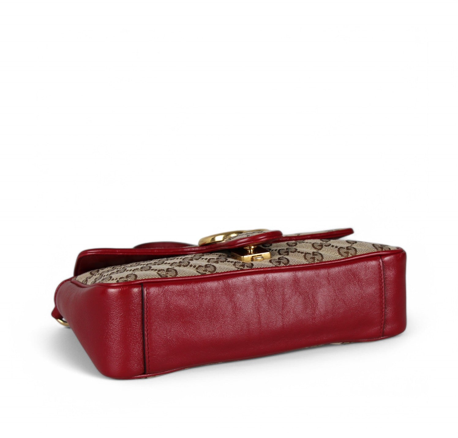 Borsa a a tracolla Gucci modello GG Marmont realizzata in tessuto beige impreziosito da Monogram GG a contrasto color Ebano e impunture diagonali. Dettagli in pelle Rosso Ancora. Metalleria dorata effetto lucido. Internamente foderata in tessuto scamosciato beige, tasca interna con cerniera. Chiusura principale a molla impreziosita da logo GG. Munita di tracolla superiore scorrevole utilizzarla anche a spalla. Minimi segni d'uso generali.