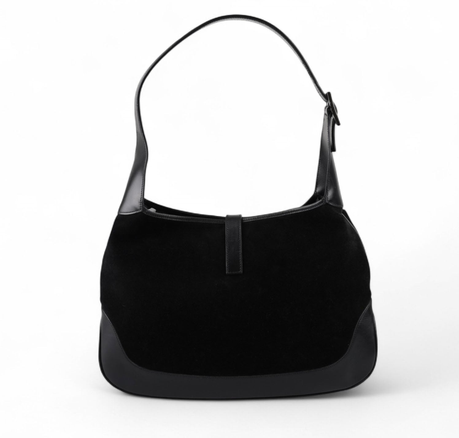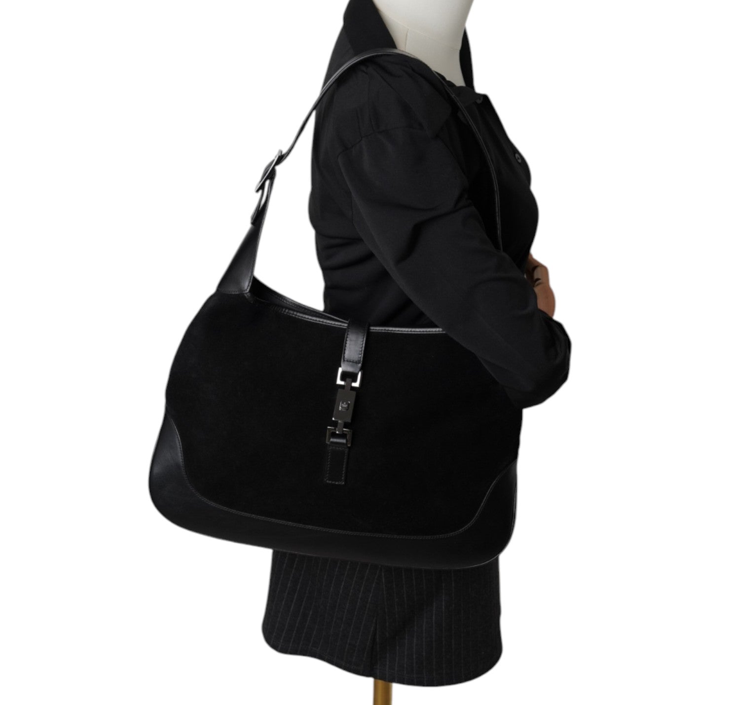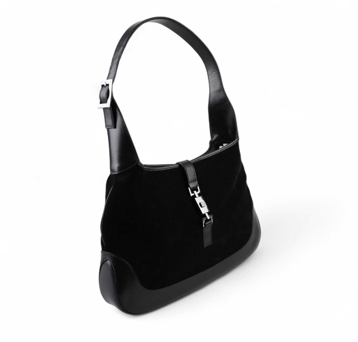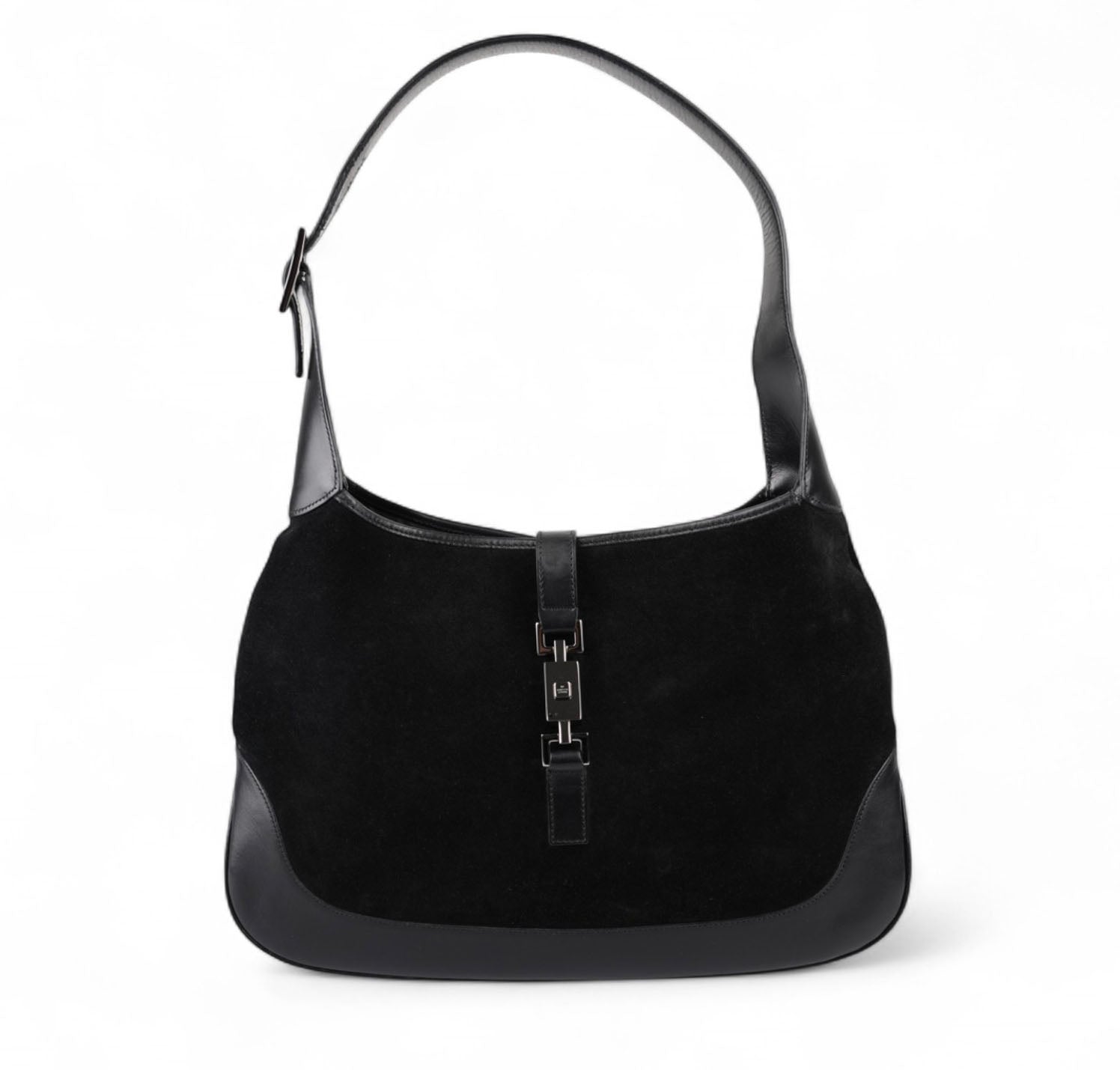Borsa Gucci, modello Jackie, realizzata in Suede e dettagli in Pelle Nera. Metalleria Argentata. Munita di manico superiore per il trasporto a spalla o mano. Chiusura principale ad incastro posta frontalmente. Interno foderato in Tessuto. Lievi segni del tempo generali. Crepa al manico superiore che non influisce sul trasporto.