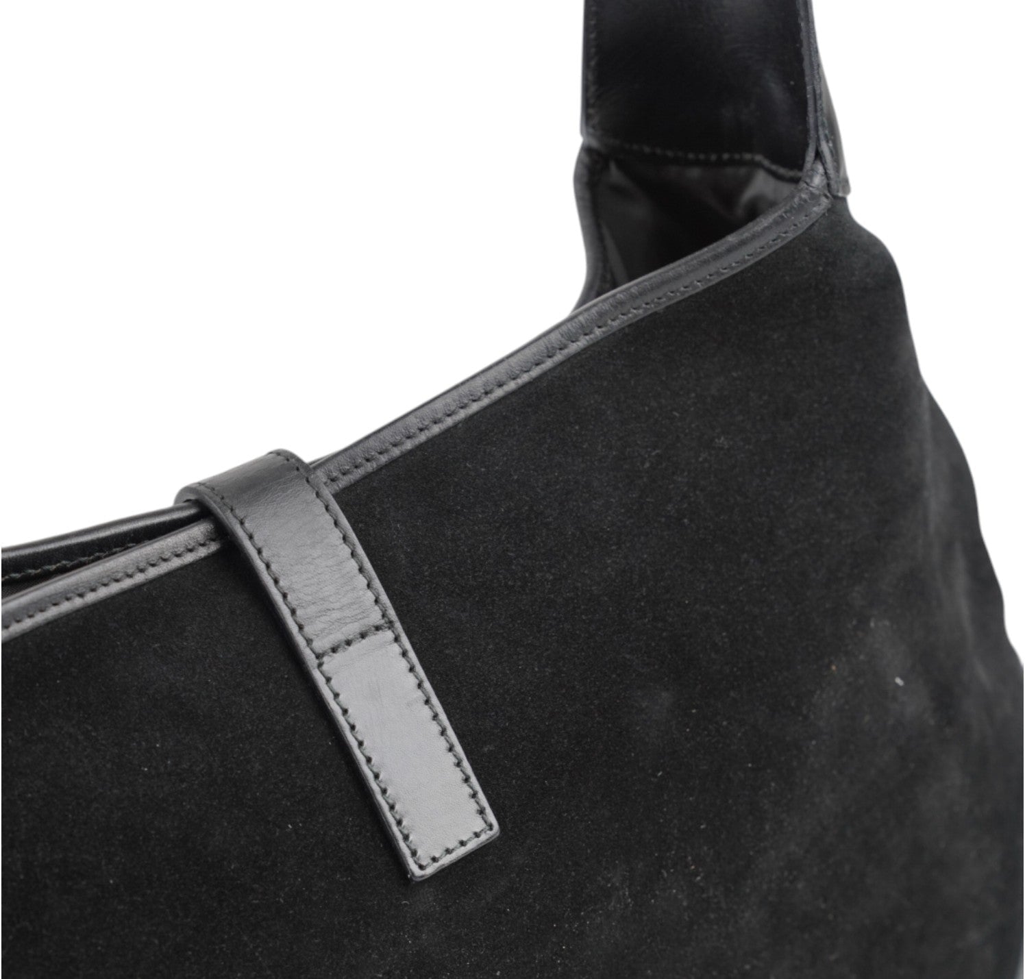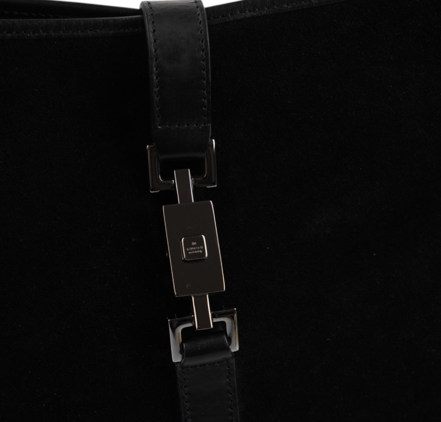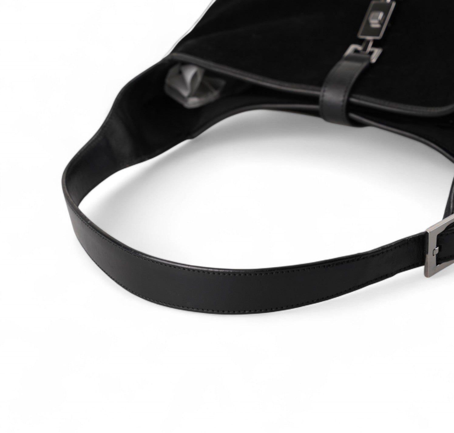 Borsa Gucci, modello Jackie, realizzata in Suede e dettagli in Pelle Nera. Metalleria Argentata. Munita di manico superiore per il trasporto a spalla o mano. Chiusura principale ad incastro posta frontalmente. Interno foderato in Tessuto. Lievi segni del tempo generali. Crepa al manico superiore che non influisce sul trasporto.