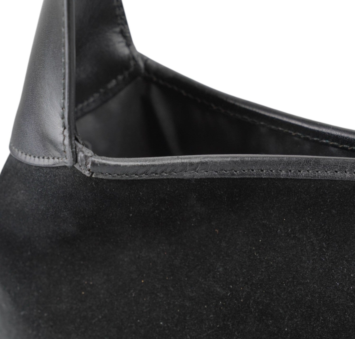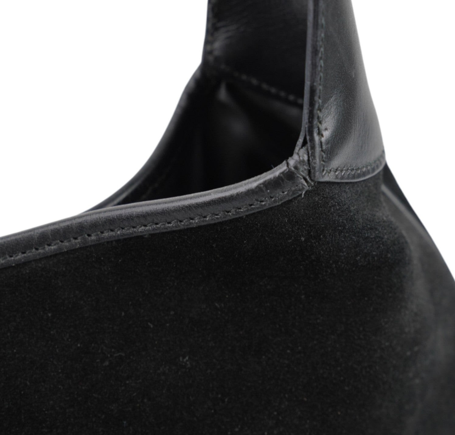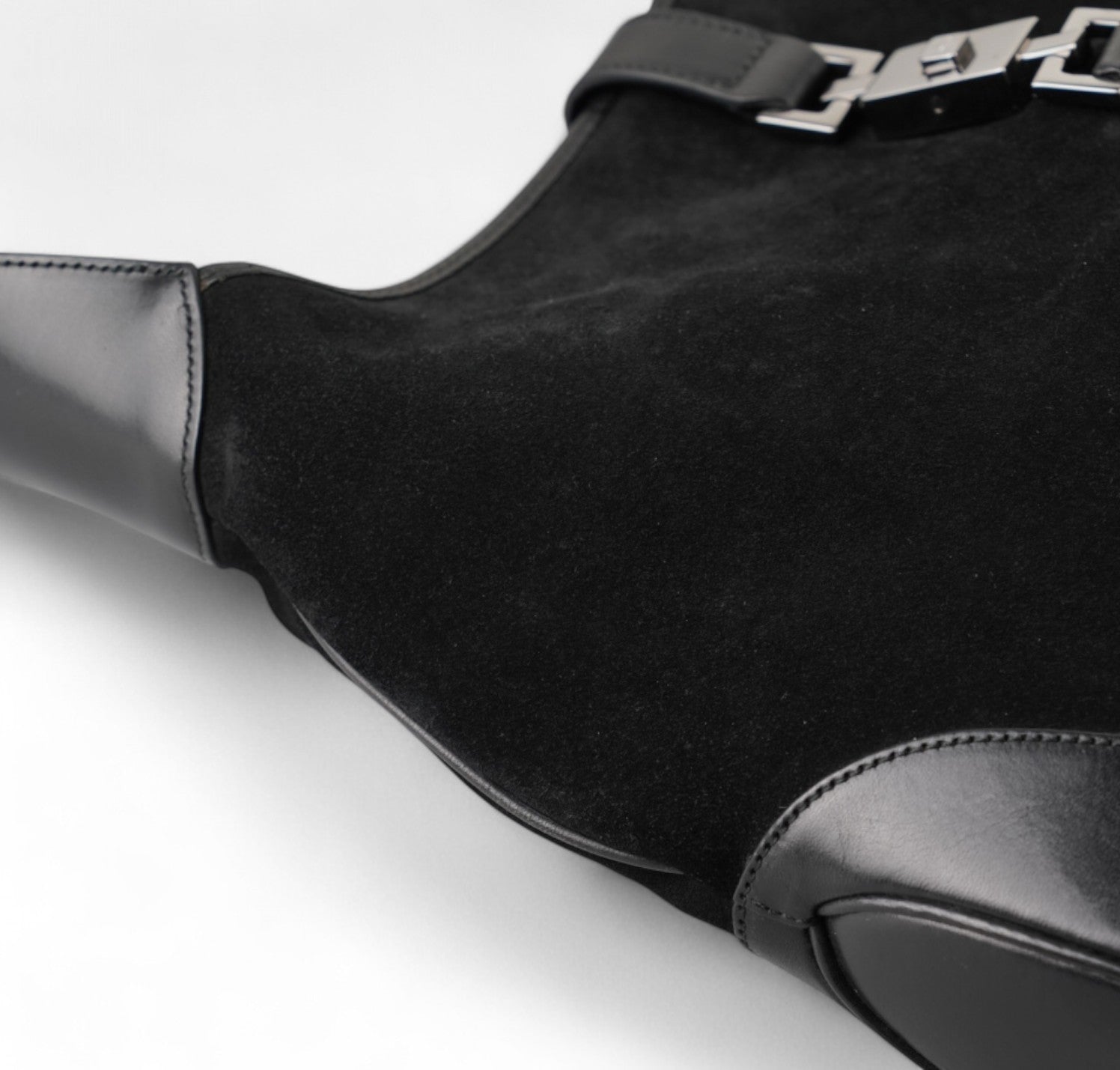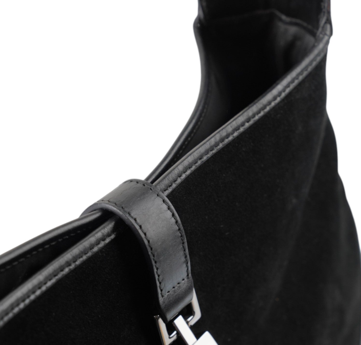 Borsa Gucci, modello Jackie, realizzata in Suede e dettagli in Pelle Nera. Metalleria Argentata. Munita di manico superiore per il trasporto a spalla o mano. Chiusura principale ad incastro posta frontalmente. Interno foderato in Tessuto. Lievi segni del tempo generali. Crepa al manico superiore che non influisce sul trasporto.