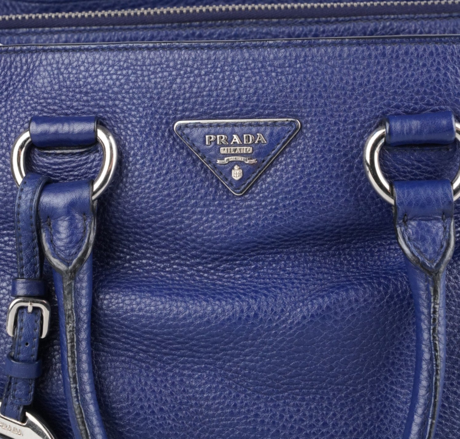 Borsa Prada, modello 2Way, realizzata in Pelle color Blu Navy. Struttura semi-morbida con doppi manici e tracolla regolabile e rimovibile per portabilità a spalla, mano o bandoliera. Interno foderato in tessuto logato con tasche e chiusura centrale con zip. Completa di porta nome coordinato. Minimi segni di utilizzo e leggeri segni di pressione su pelle dovute al normale utilizzo. Micro graffi metalleria.