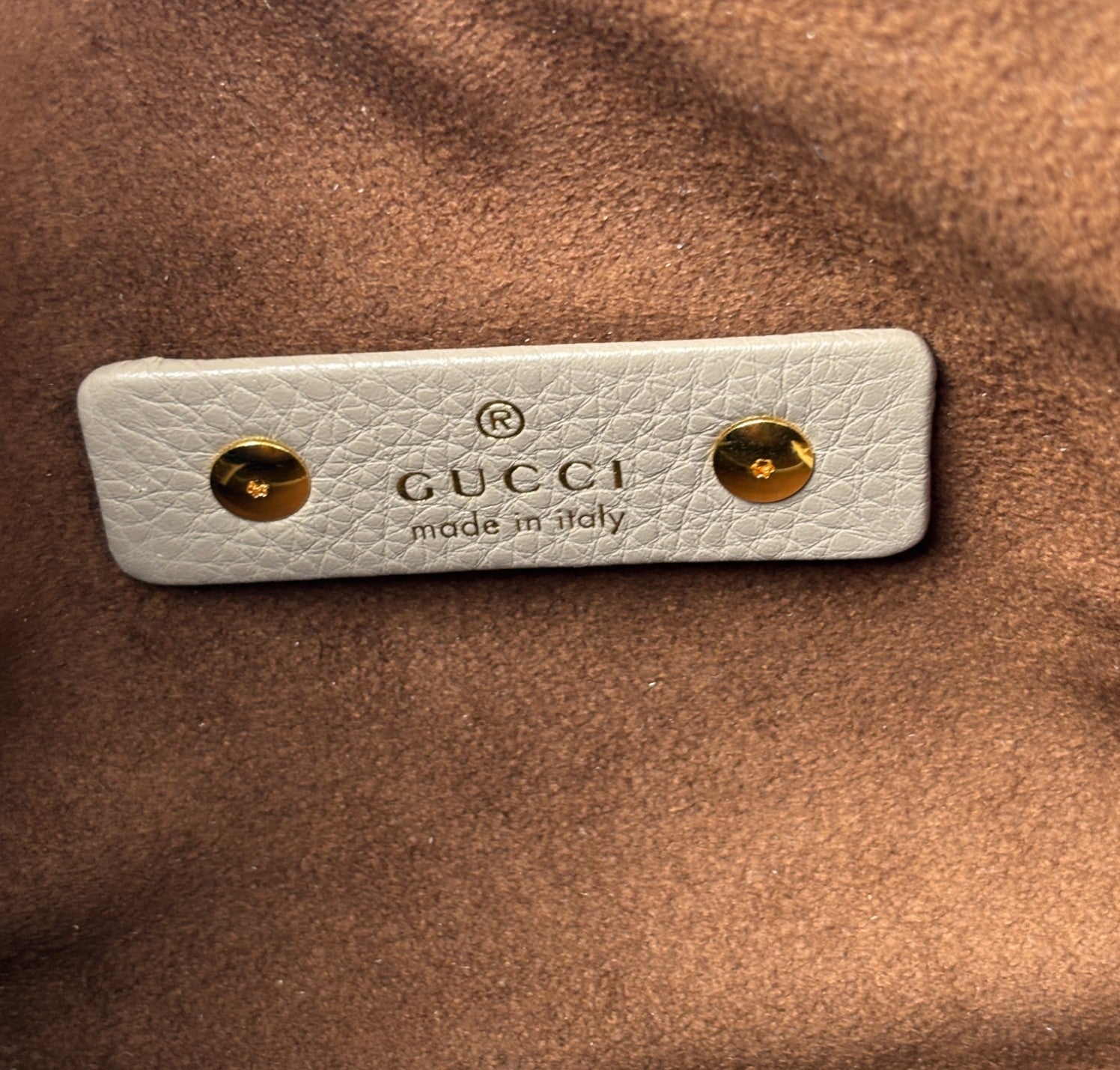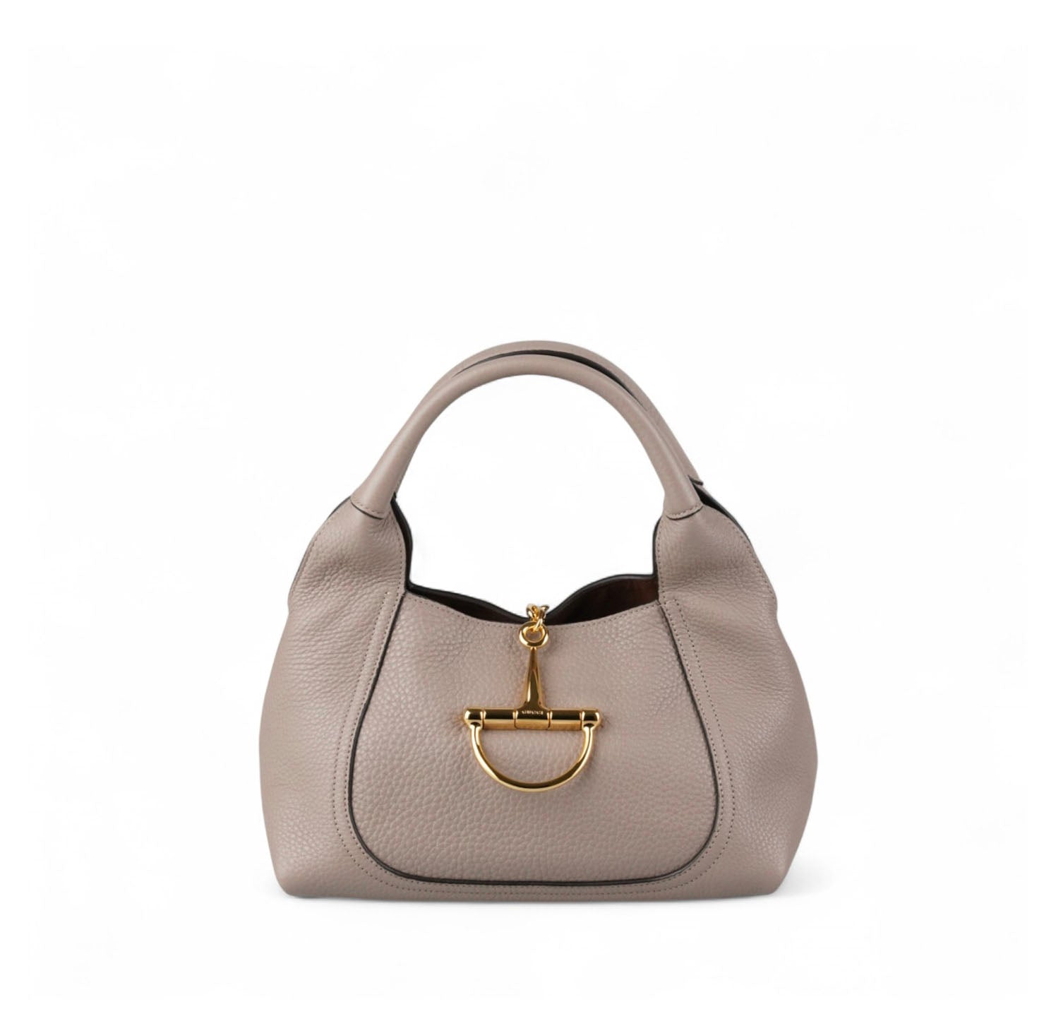 Borsa a spalla Gucci, modello Softbit, misura Media, realizzata in Pelle Granata (grainy) Tortora con chiusura a mezza fibbia Horsebit oversize. Finiture in metallo dorato. Interno in microfibra marrone. Manici superiori per il trasporto a braccio o mano. Modello nuova collezione, di produzione recente. Non presenta segni d'uso ma potrebbe comunque presentare micro segni di stoccaggio.